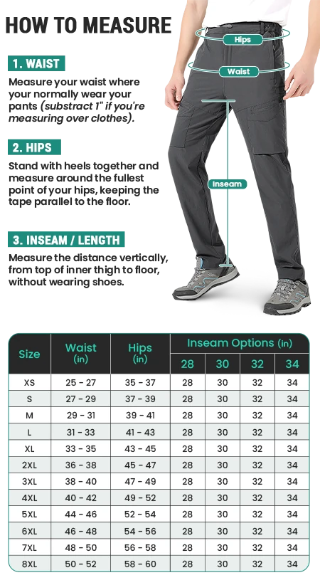 Our size chart is meticulously crafted to match your measurements, ensuring each pair of pants fits just right. See the guide below for how to measure.